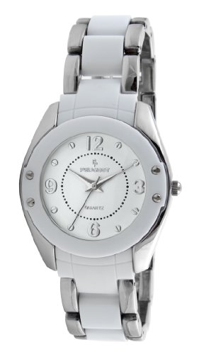 This round Peugeot Women's nail head bezel watch features a hybrid silver- tone and white acrylic link bracelet, giving you a flexible option for dress or casual appeal. Large Arabic numerals at 3, 6, 9, and 12 make the dial easy to read. The other markers feature a unique nail head design. Japanese quartz movement brings durability to the mechanism. Look elegant this season with this stunning timepiece from Peugeot. Read more customer reviews ...